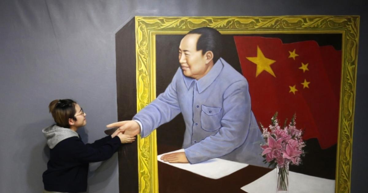 A visitor poses for a photograph in front of a 3D painting depicting China's late Chairman Mao Zedong at a 3D art gallery in Beijing. The gallery attracts visitors with various 3D paintings and installations depicting world famous political leaders, celebrities and movie scenes. Photographer: Kim Kyung-Hoon/Reuters
