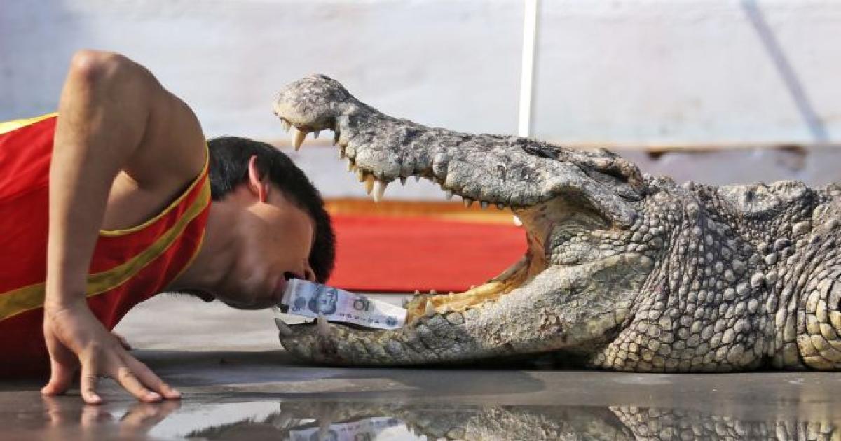 A trainer picks up Chinese Yuan banknotes from the open mouth of a crocodile during a performance at a zoo in Wenling, Zhejiang province. Photograph: Reuters