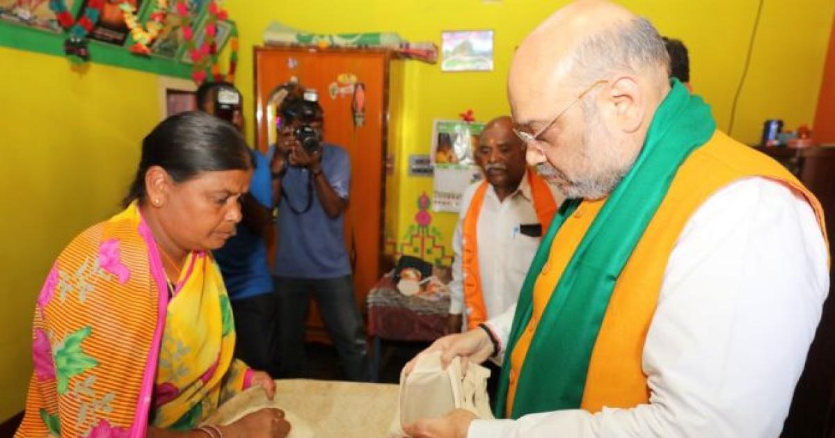 IMAGE: Amit Shah joined the statewide door to door campaign "Mushti Dhanya Sangrah Abhiyana" in Chinnenahalli Village, Srirangapatna, Mandya. Photograph: @AmitShah/Twitter