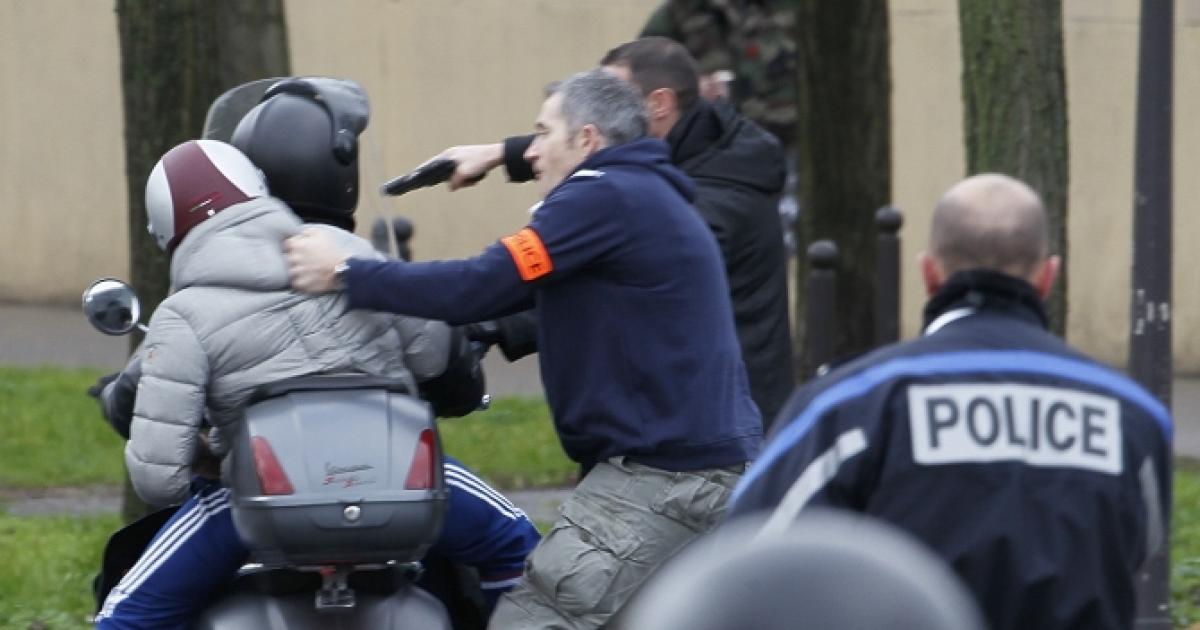 French police forcibly stop at gun point young people on a scooter as they arrive near the scene of a hostage taking at a kosher supermarket in eastern Paris. Photographer: Youssef Boudlal/Reuters