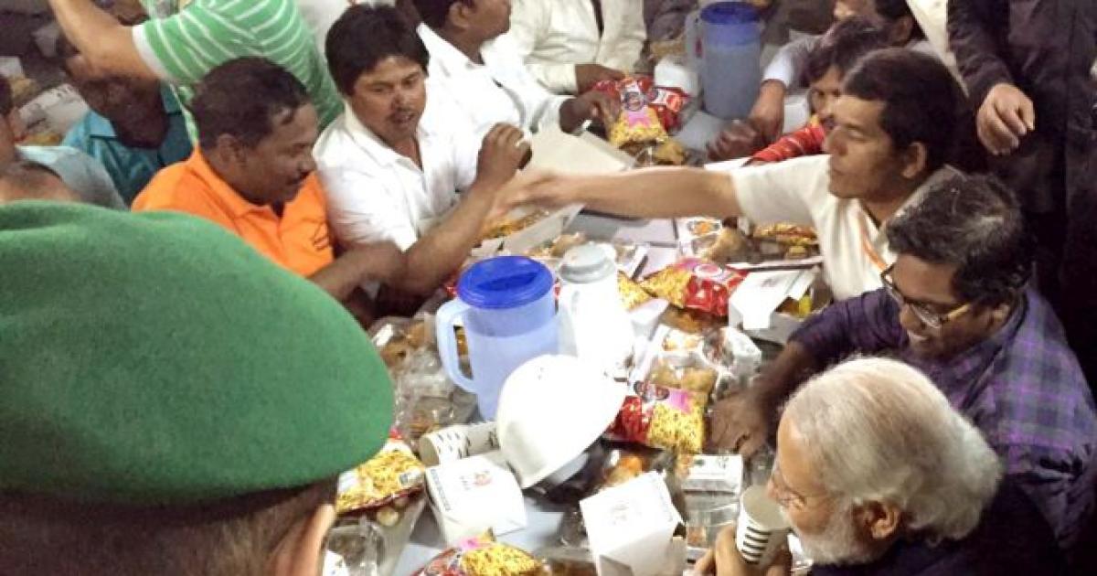 PM Narendra Modi sharing snacks with workers at the L&T residential complex, in Riyadh. Speaking to the blue-collared workers, he said, “It is your sweat and toil that has brought me here. Your happiness is my happiness and when you are not happy, I feel the same.” Photograph: MEAIndia/Facebook