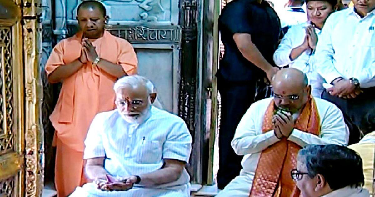 Flanked by BJP president Amit Shah and Adityanath, Modi entered the temple dedicated to Lord Shiva and paid obeisance to the deity as priests recited Sanskrit 'shlokas' in the sanctum sanctorum and blew conch shells.