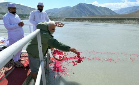Sharing the pictures on Twitter, Modi said, "Performed Sindhu Puja in Nimu yesterday. Prayed for the peace, progress and prosperity of our nation."