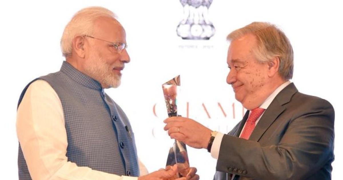 Modi and French President Emmanuel Macron were jointly awarded the UN's highest environmental honour for their pioneering work in championing the International Solar Alliance and promoting new areas of cooperation on environmental action, according to a statement from the United Nations Environment Programme (UNEP).