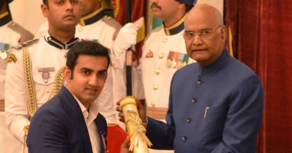Former cricketer Gautam Gambhir receives the Padma Shri from the president. A leading batsmen of the Indian team, he played a critical role in India winning the T20 Cricket World Cup 2007 and World Cup 2011. Photograph: @rashtrapatibhvn/Twitter