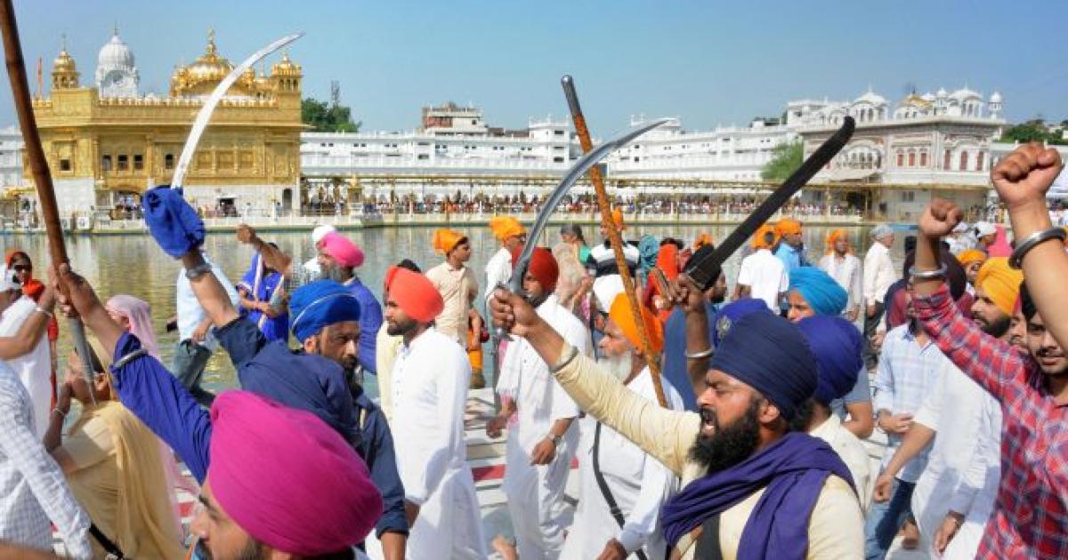 Some people in the gathering were also seen brandishing swords and wearing t-shirts and carrying banners with pictures of Jarnail Singh Bhindranwale, head of Sikh religious sect Damdami Taksal who was killed in the military operation.