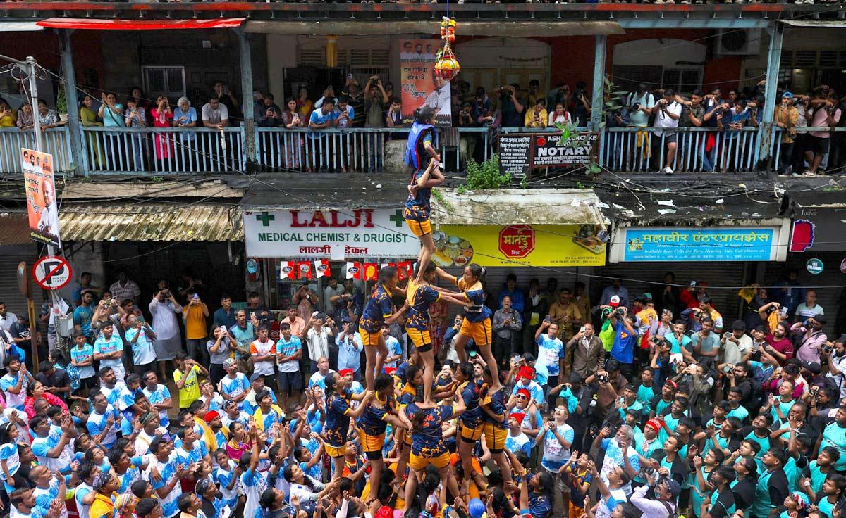 The festival, celebrated to mark the birth of Lord Krishna, saw troupes of young men and women forming human pyramids to break dahi handis (pots of curd) suspended in the air with ropes.