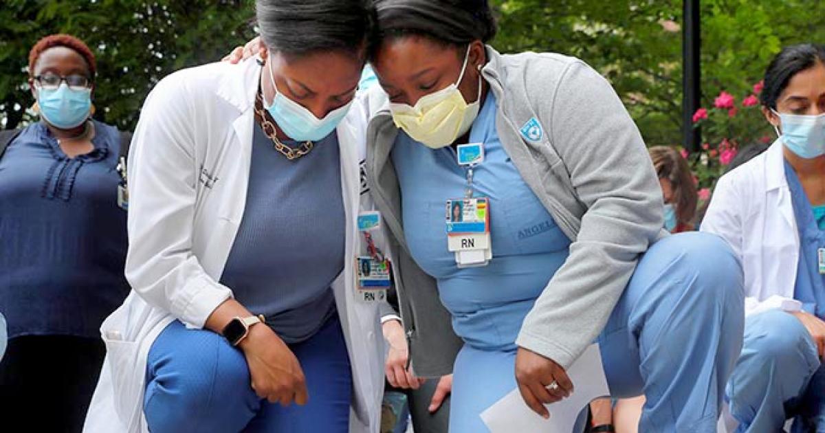 IMAGE: Nurses Sasha Dubois and Farah Fevrin kneel for the 8 minutes and 46 seconds of silence during a vigil at Brigham and Women’s Hospital, where many coronavirus disease patients have been treated, against the death in Minneapolis police custody of George Floyd, in Boston, Massachusetts, US. Photograph: Brian Snyder/Reuters