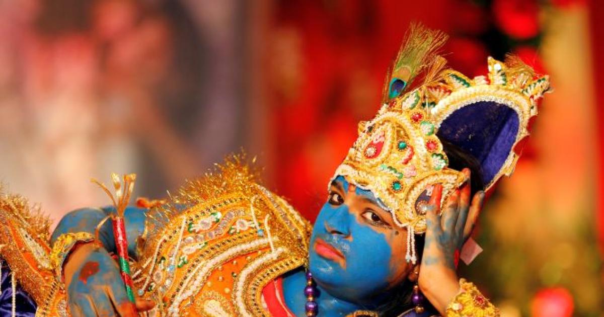 A girl dressed up as Hindu Lord Krishna performs during Janmashtami festival celebrations marking the birth of Lord Krishna, in Ahmedabad. Photograph: Amit Dave/Reuters