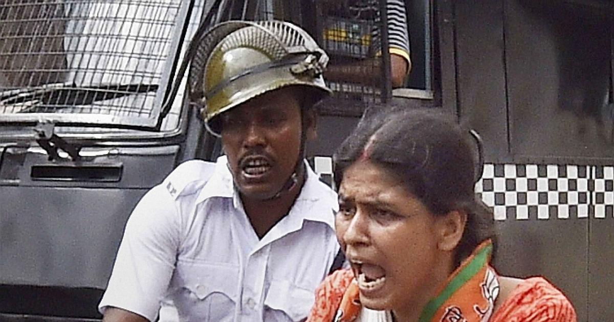 A police person tries to stop a BJP woman activist protesting against JNUSU President Kanhaiya Kumar outside the venue of a joint AISF and AIYF Convention in Kolkata on Thursday. Photograph: Ashok Bhaumik/PTI Photo