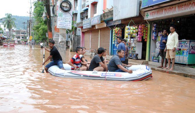 Residents commute on a boat in Anilnagar area of Guwahati on Tuesday. Floods in Assam have affected six districts.