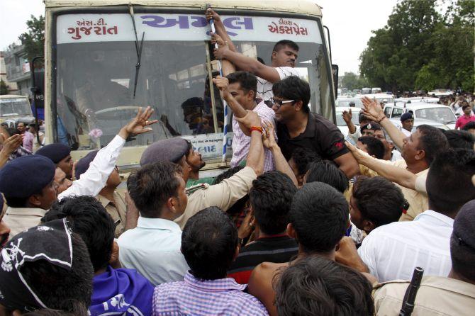 Police detain members of Dalit community who were staging a protest in Ahmedabad on Tuesday against the assault on Dalits by cow protectors in Rajkot district, Gujarat. Photograph: PTI Photo