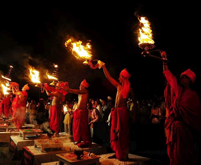Priests performing prayer at Sangam on the occasion of Guru Purnima festival in Allahabad on Tuesday evening. Photograph: PTI Photo