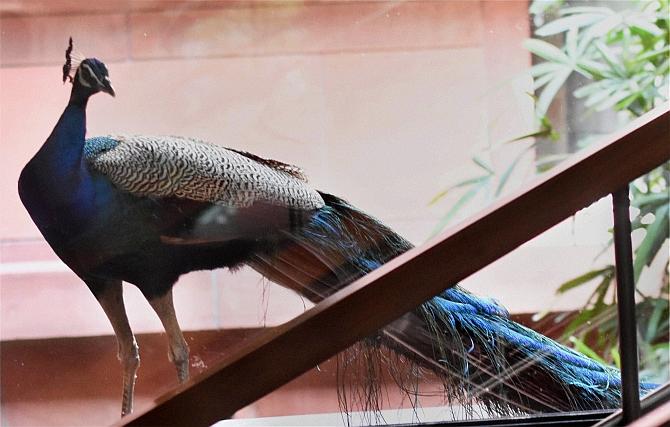 A peacock sits on a window at Parliament Library building during the monsoon session at parliament in New Delhi on Tuesday. Photograph: Subhav Shukla/PTI Photo