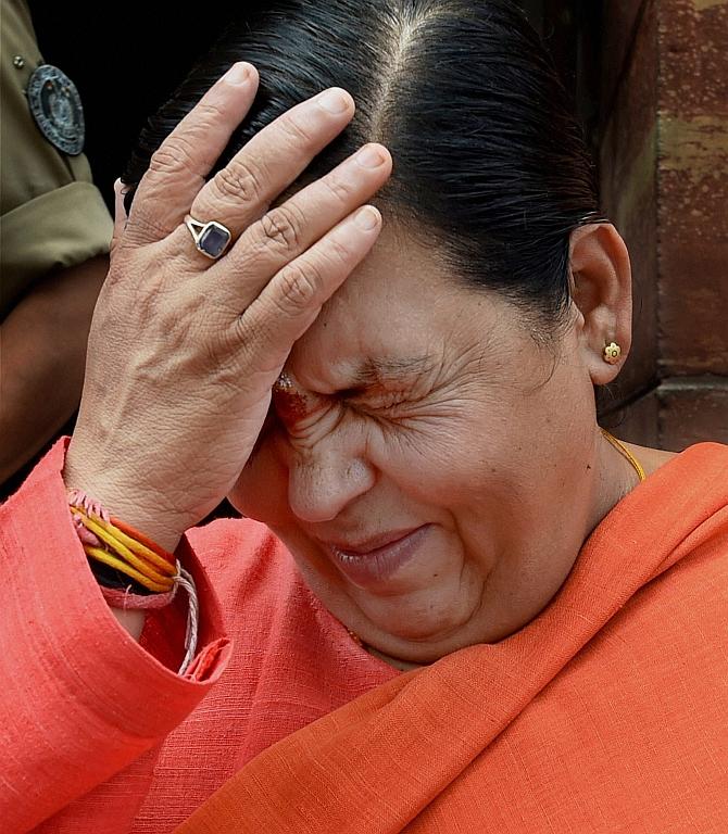 Union Minister for Ganga Rejuvenation Uma Bharti reacts at Parliament house during the monsoon session in New Delhi on Tuesday. Photograph: Manvender Vashist/PTI Photo