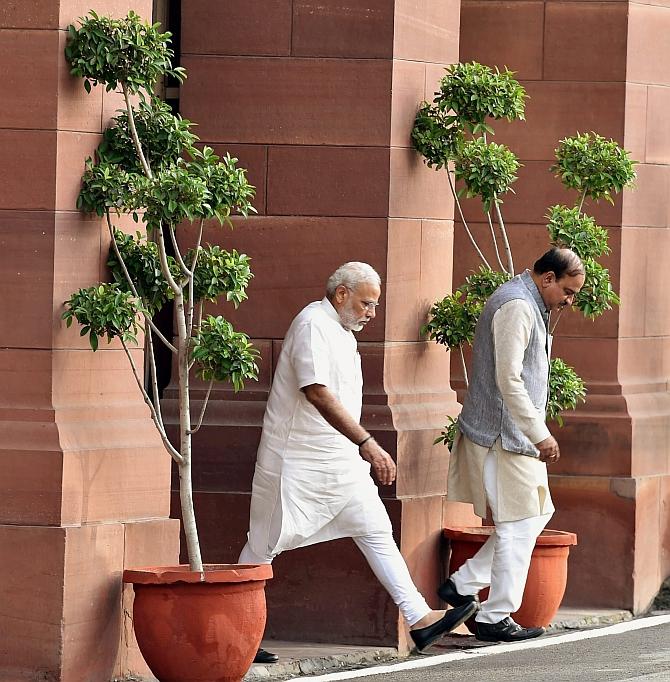 Prime Minster Narendra Modi with Union Parliamentary Affairs Minister Ananth Kumar arrives to attend BJP Parliamentary Party's executive meeting. Photograph: Shahbaz Khan/PTI Photo