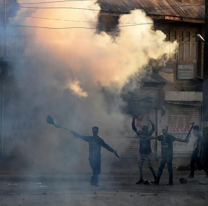 Protesters throw stones on police amid tear smoke during clashes in Srinagar on Tuesday. Photograph: S Irfan/PTI Photo
