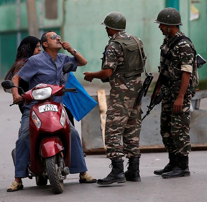 A man shows his tooth to a security personnel as he seeks permission to see a doctor after being stopped during a curfew in Srinagar on Tuesday. Photograph: Danish Ismail/Reuters