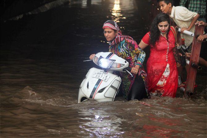 A girl pushes her scooter at a waterlogged road after heavy rains in Faridabad. Photograph: PTI Photo