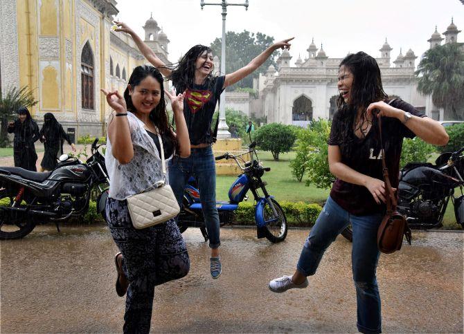 Tourists enjoy heavy rains at Chawmahallah Palace in Hyderabad on Tuesday. Photograph: PTI Photo