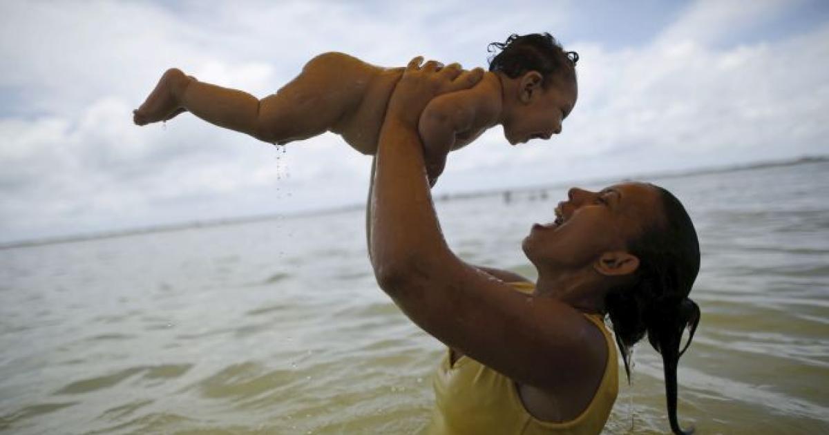 A woman holds her 4-month-old daughter who was born with microcephaly in the sea in Olinda, Brazil. Brazil is investigating more than 4,000 suspected cases of microcephaly, a condition in which infants are born with abnormally small heads and can suffer developmental problems that may be linked to the Zika outbreak. Photograph: Ueslei Marcelino/Reuters