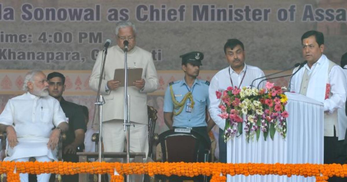 Watched by Prime Minister Narendra Modi, BJP chief Amit Shah, senior party leader L K Advani, party chief ministers and leaders of the National Democratic Alliance, 54-year-old Sonowal and his ministers were administered the oath of secrecy by Governor Padmanabha Balakrishna Acharya at a well attended public function at Khanapara field in Guwahati. He took his oath in Assamese.