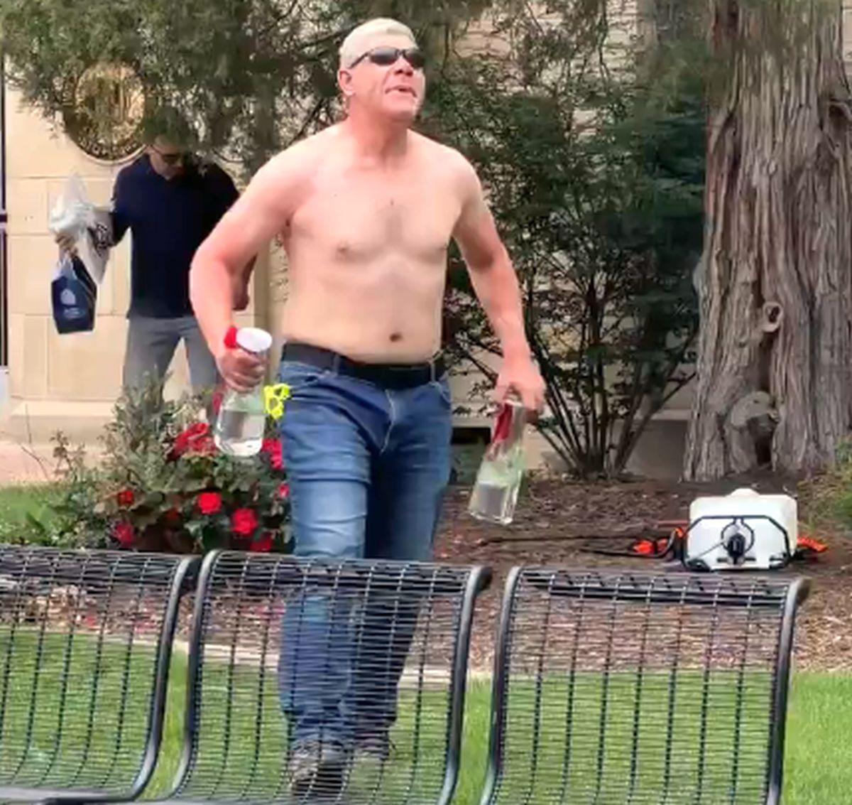 In one video, apparently of the attack, a shirtless man holding clear bottles in his hands is seen pacing as the grass in front of him burns.