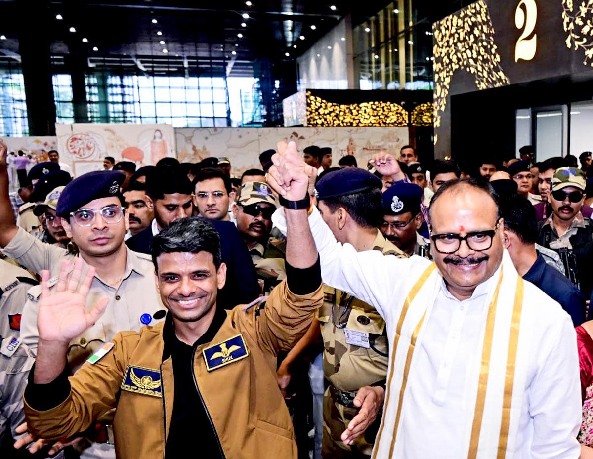 Family members, including his parents Shambhu and Asha Shukla, wife Kamna, and son Kiash, were present at the airport to greet him. They were joined by cheering crowds waving the tricolour and chanting "Vande Mataram".