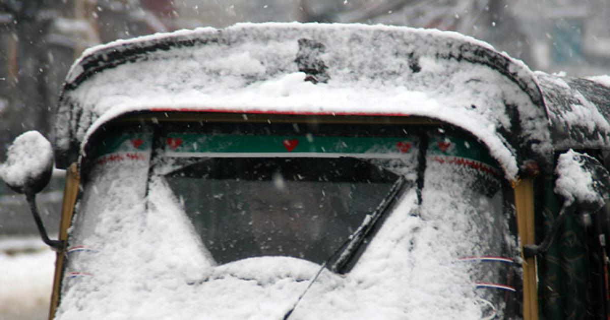 An auto rickshaw driver tires to make his way through the streets of Kashmir amid heavy snow.