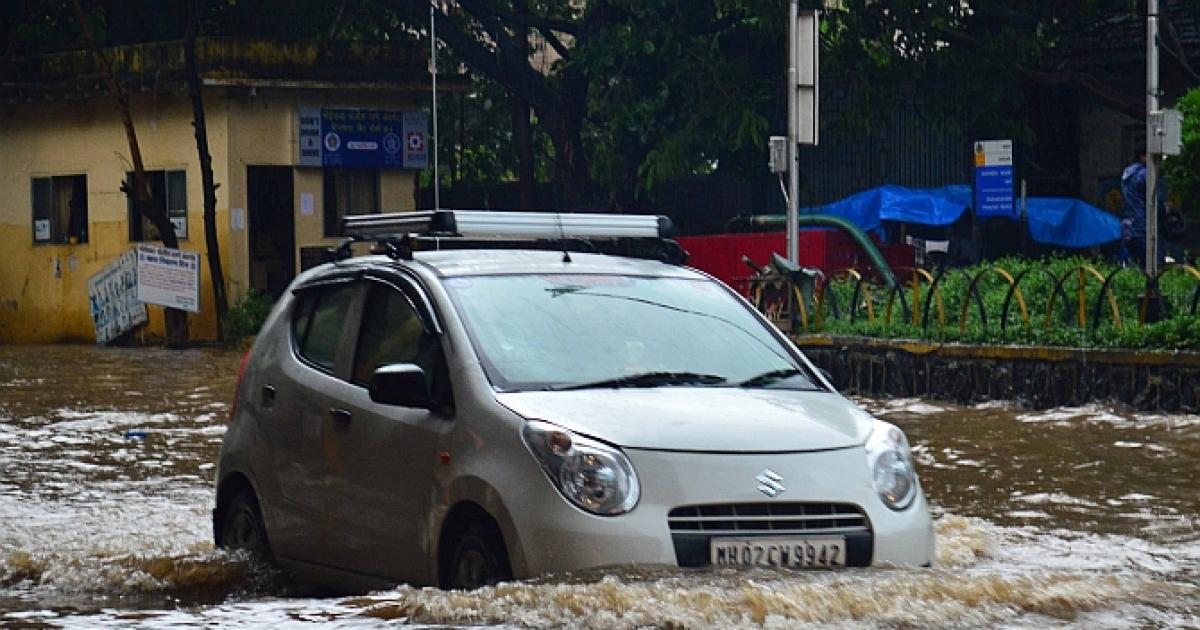 A car move through a water logged road after heavy rains at Hindamata, in Mumbai on Saturday. Photograph: PTI Photo