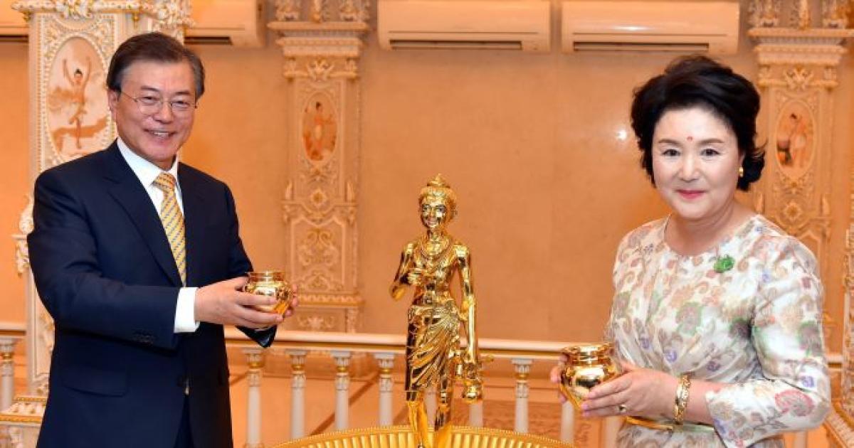 IMAGES: South Korean President Moon Jae-in and First Lady Kim Jung-sook visit Akshardham Temple in New Delhi on Sunday. All Photographs: Kamal Kishore/PTI Photo