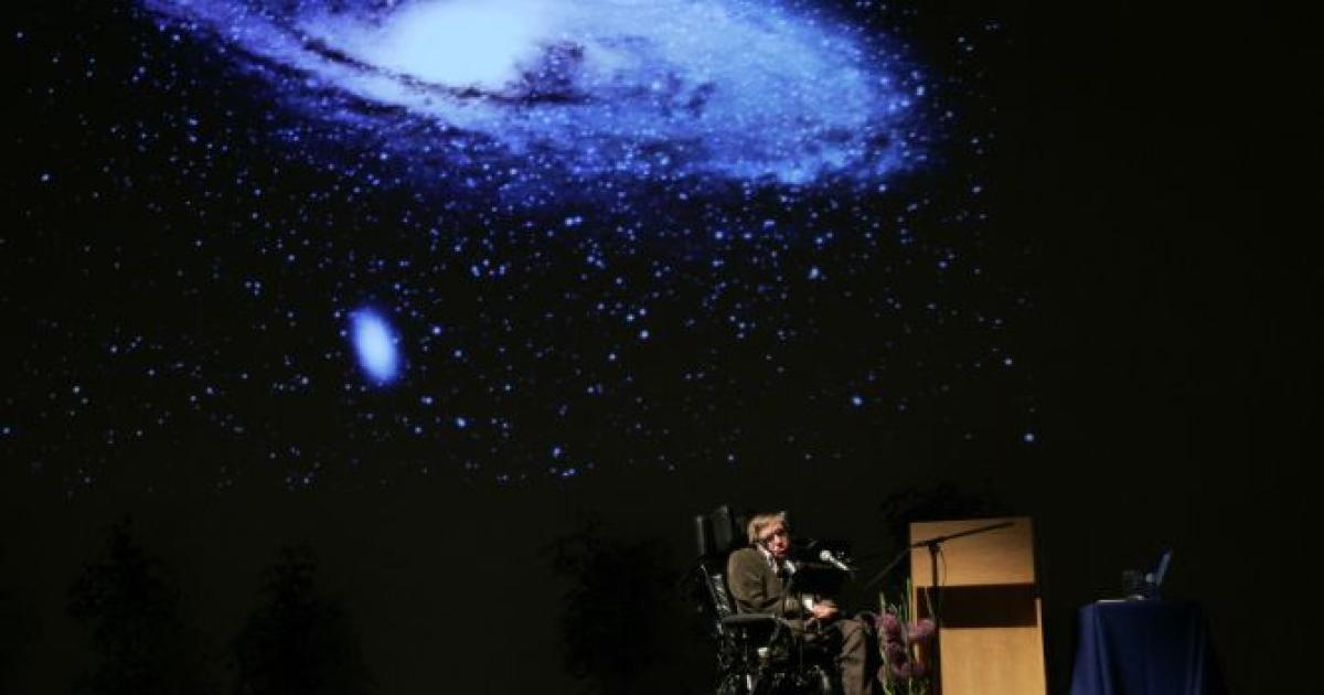 Who knew the universe better than Prof Hawking? Here's him delivering a lecture on 'The Origin of the Universe' at the Heysel conference hall in Brussels. Photograph: Francois Lenoir/Reuters.