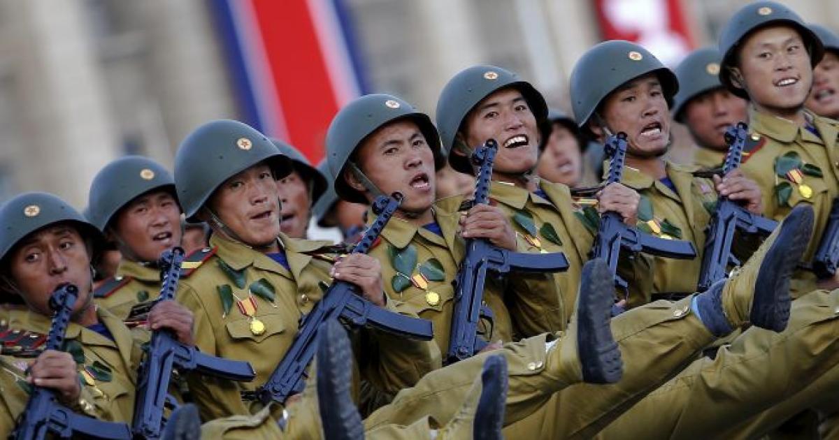Soldiers shout slogans as they march past a stand with North Korean leader Kim Jong Un during the parade celebrating the 70th anniversary of the founding of the ruling Workers’ Party of Korea, in Pyongyang. Photograph: Damir Sagolj/Reuters