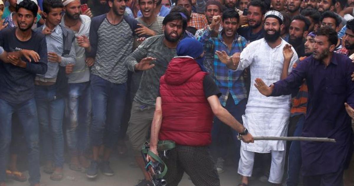 Kashmiris attend the funeral of Bilal Ahmed, a suspected militant who was killed in a gunbattle with security forces, in Khudwani, in Kulgam, even as one of the ultras tries to do crowd control with a stick and gun. Photograph: Danish Ismail/Reuters