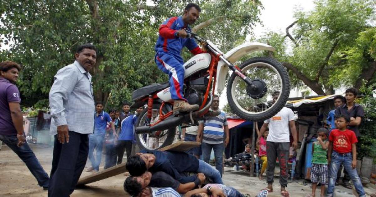A Hindu devotee performs a stunt with his motorcycle during a rehearsal for the annual Rath Yatra, or chariot procession, in Ahmedabad, India. Hindu devotees perform various stunts as part of the annual Rath Yatra celebrations which commemorates a journey by Hindu god Jagannath, his brother Balabhadra and sister Subhadra, in specially made chariots. The annual Rath Yatra is celebrated on July 18. Photograph: Amit Dave/Reuters