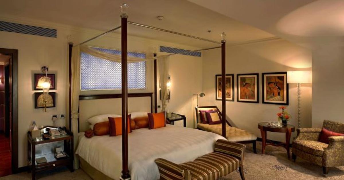 The Chanakya Suite spans 4,600 sq ft, costs around ₹8 lakh a night, and includes steam and sauna areas in addition to living quarters. The Tyeb Mehta paintings and illustrations from the Arthashastra on the wall lend the traditional touch while the Villeroy and Boch crockery and Cristal De Paris glassware add a touch of global luxury.