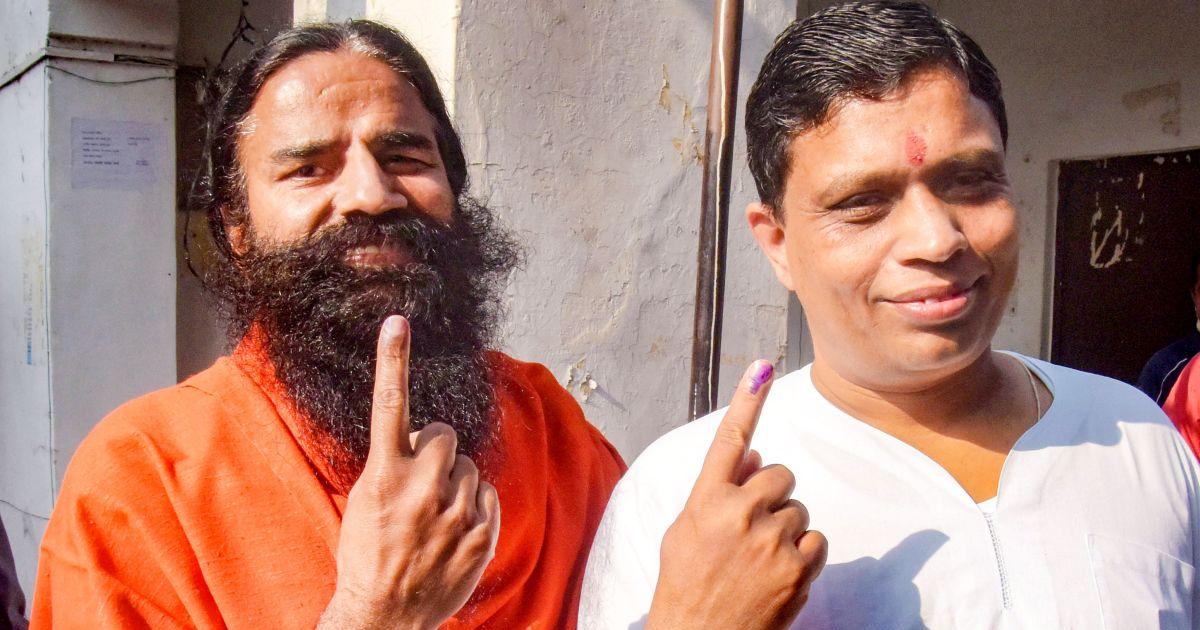 IMAGE: Yoga Guru Baba Ramdev and Acharya Balkrishna show their inked finger after casting their vote in Haridwar, on Monday, February 14, 2022. Photograph: PTI Photo
