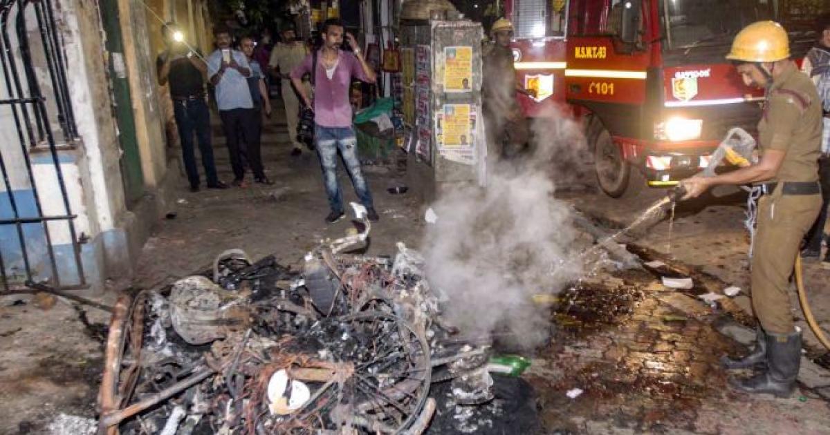 Several motorcycles parked outside were vandalised and set ablaze. Shards of broken glass littered the lobby of the college where a bust of Ishwar Chandra Vidyasagar, a noted philosopher and a key figure of Bengal Renaissance, was smashed to smithereens. Police personnel were seen trying to douse the fire with buckets filled with water.