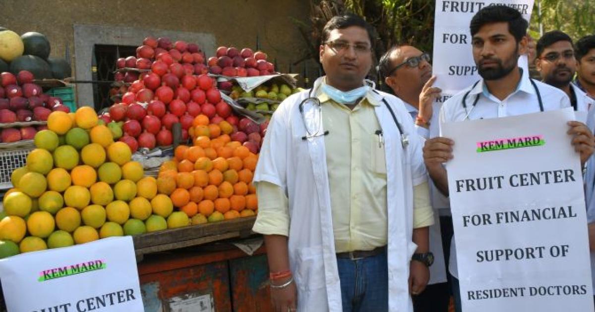 It’s not every day that you see doctors selling fruits to the public. However, on Thursday, doctors attached to Mumbai’s KEM Hospital sold fruit outside the hospital gates to protest the irregularity in payment of their stipends. The doctors had set up fruit stalls outside gates 1, 4 and 7 of the hospital situated in central Mumbai's Parel area. Photograph: Sahil Salvi/Rediff.com