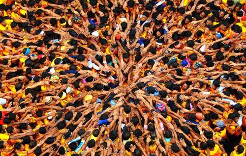 Govinda players gather together under Dahi Handi to make a human pyramid in order to catch and then break an earthen pot high in the air with the help of a rope, to win prizes. Photograph: Money Sharma