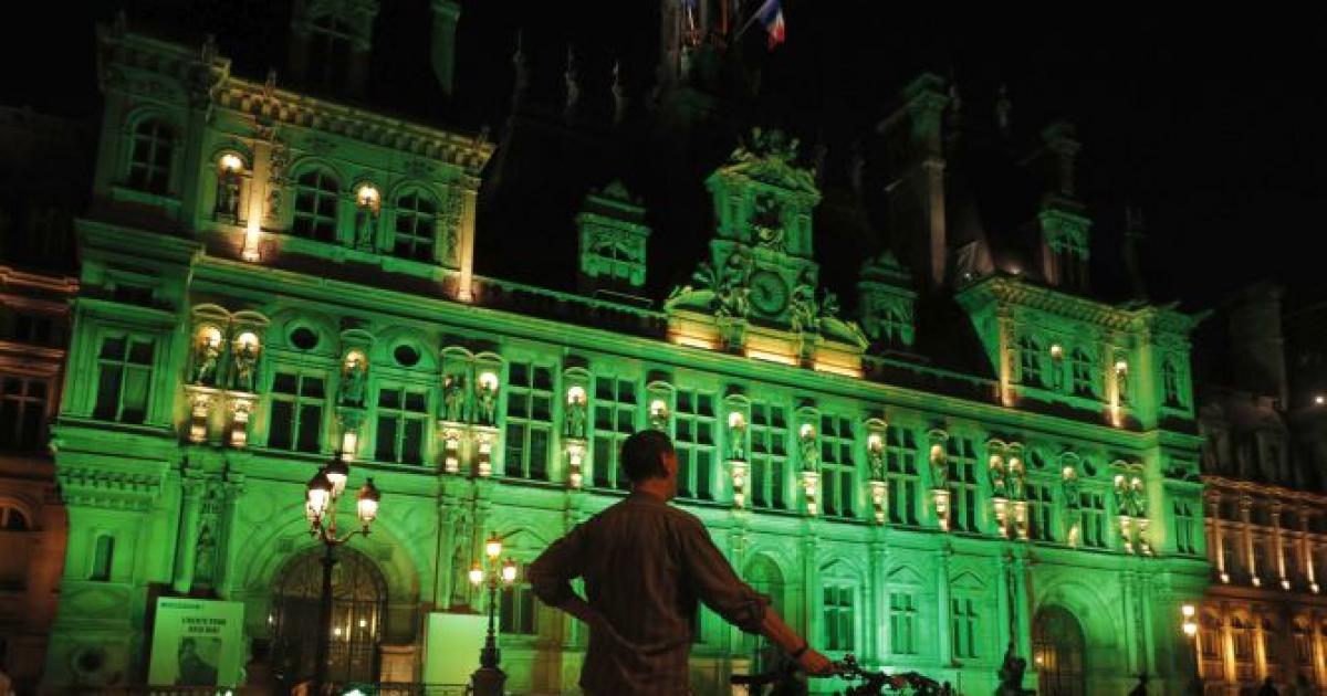 Green lights are projected onto the facade of the Hotel de Ville in Paris. Photograph: Philippe Wojazer/Reuters