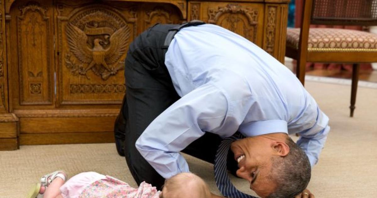 Child’s play: “At the President’s insistence, Deputy National Security Advisor Ben Rhodes brought his daughter Ella by for a visit. As she was crawling around the Oval Office, the US President got down on his hands and knees to look her in the eye.” Photograph: Pete Souza/White House