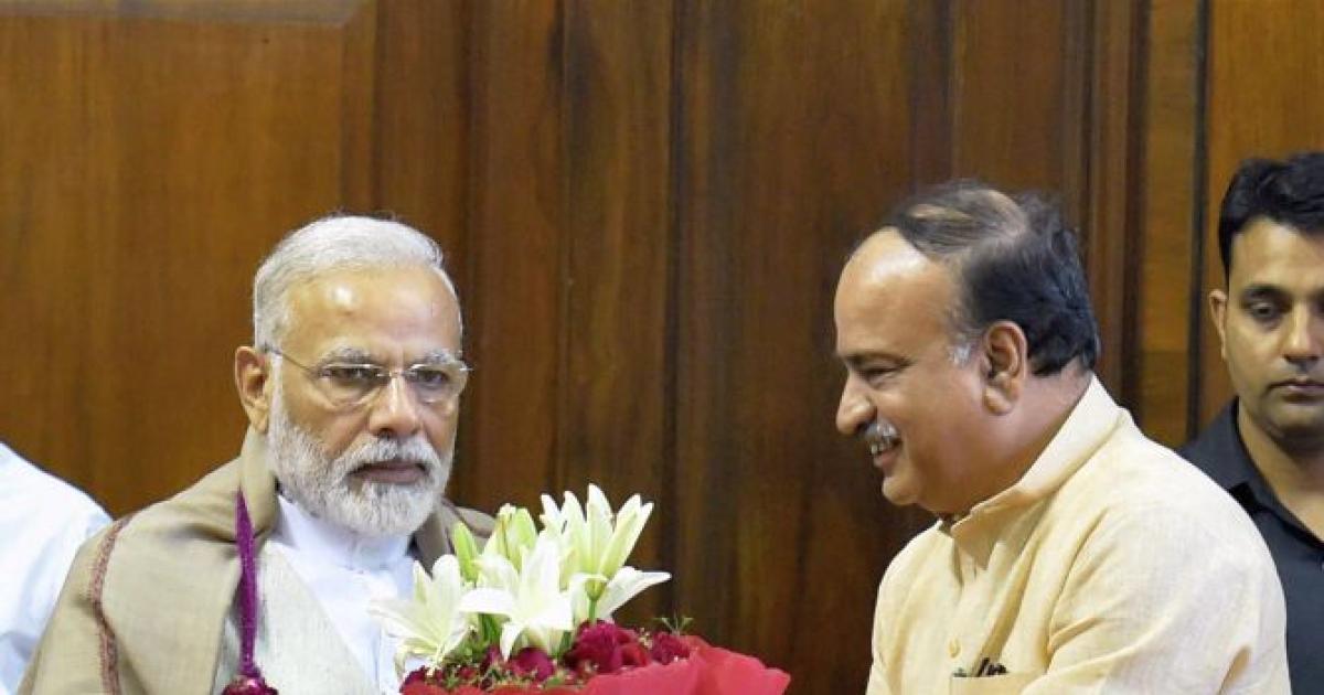 IMAGE: Prime Minister Narendra Modi being greeted by Parliamentary Affairs Minister Ananth Kumar at a function organised at Parliament in New Delhi on Wednesday to thank him for passage of the OBC bill in Lok Sabha. Photograph: Manvender Vashist/PTI Photo