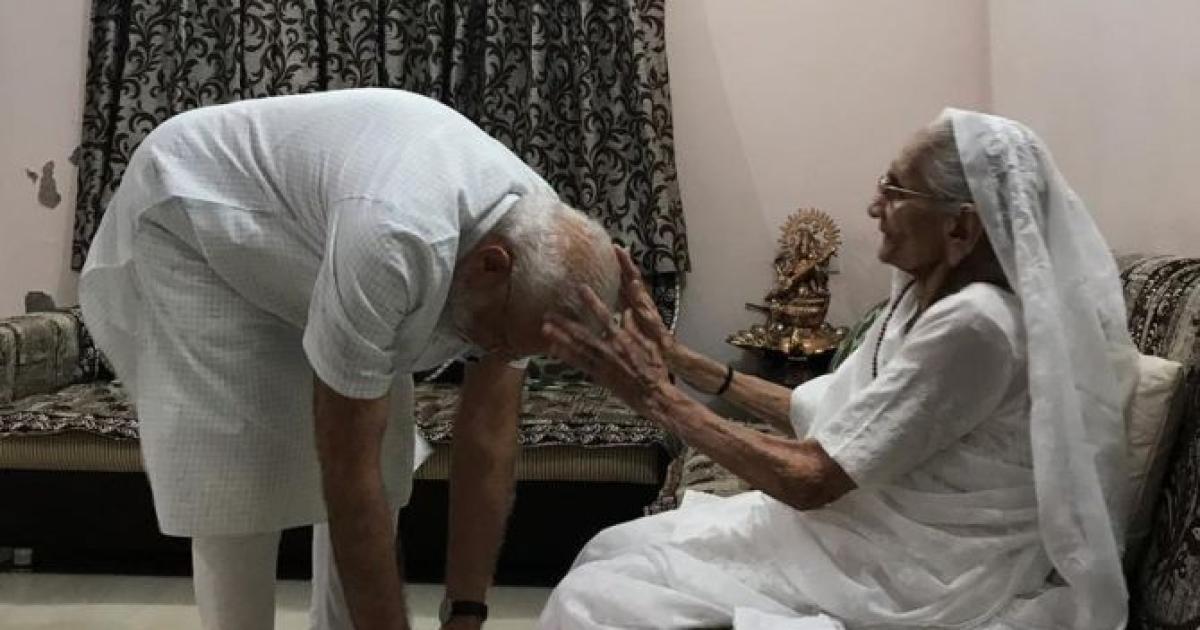 Prime Minister Narendra Modi visited his mother Hiraba Modi in Gandhinagar on Sunday evening and sought her blessings after his massive electoral victory in the recently-conducted Lok Sabha polls.