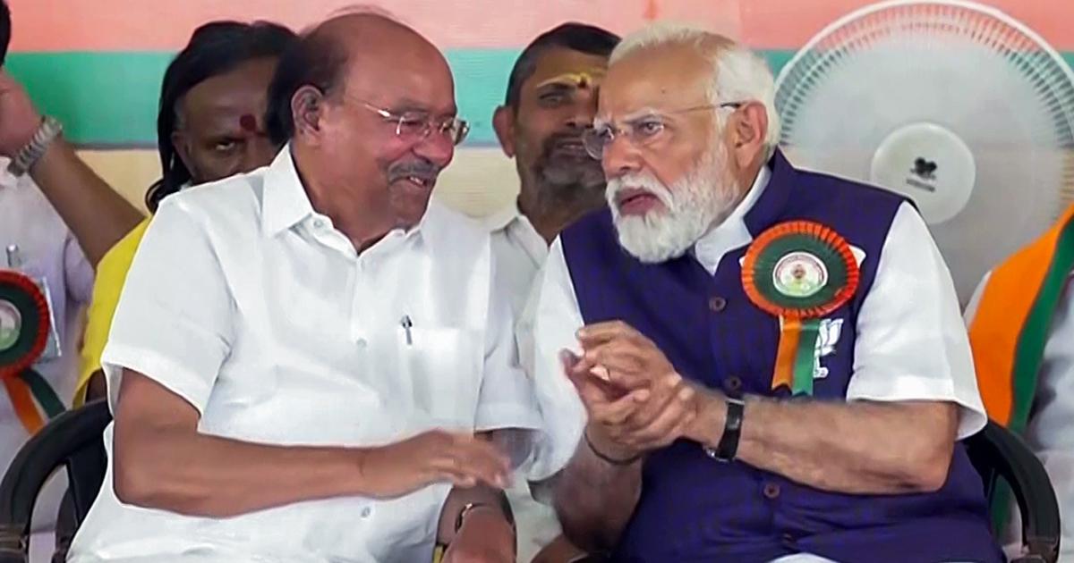 IMAGE: Prime Minister Narendra Modi speaks with Pattali Makkal Katchi party founder Dr S Ramadoss (left) during a public meeting in Salem, Tamil Nadu, March 19, 2024. Photograph: ANI Photo