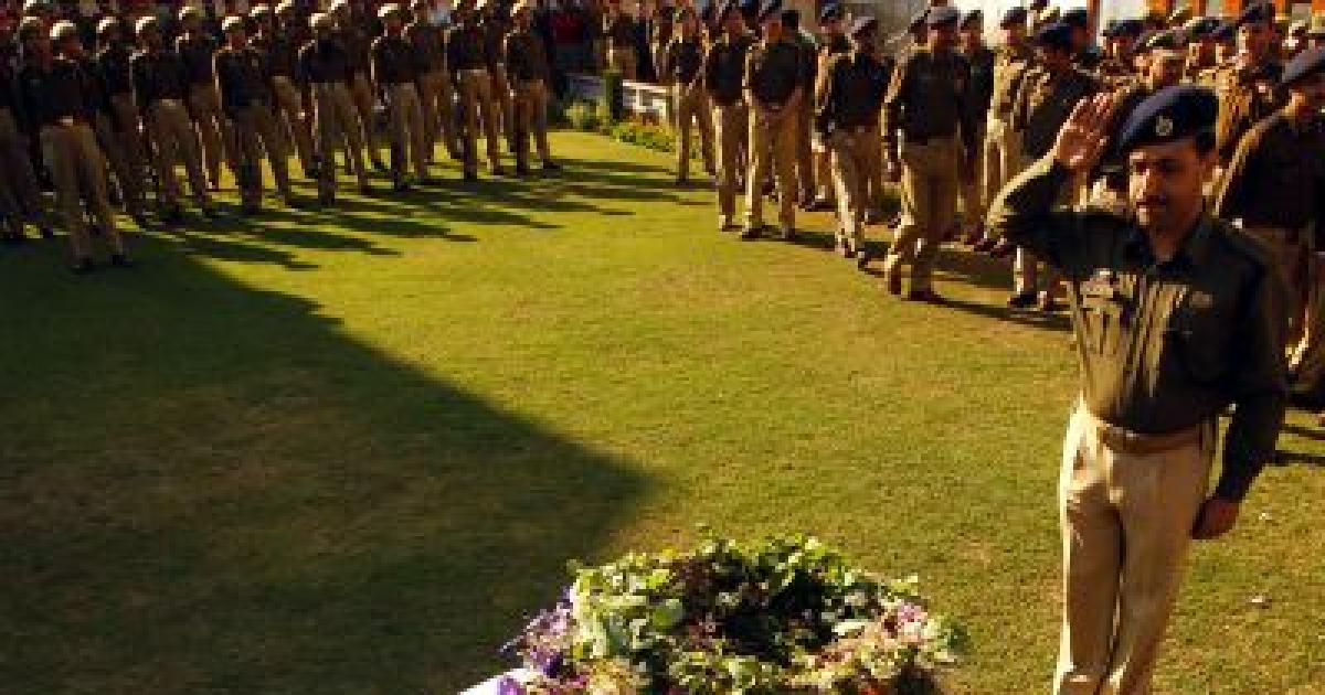 Image: A senior police officer salutes coffins of two policemen who were killed in a terrorist strike in Srinagar in April, 2011