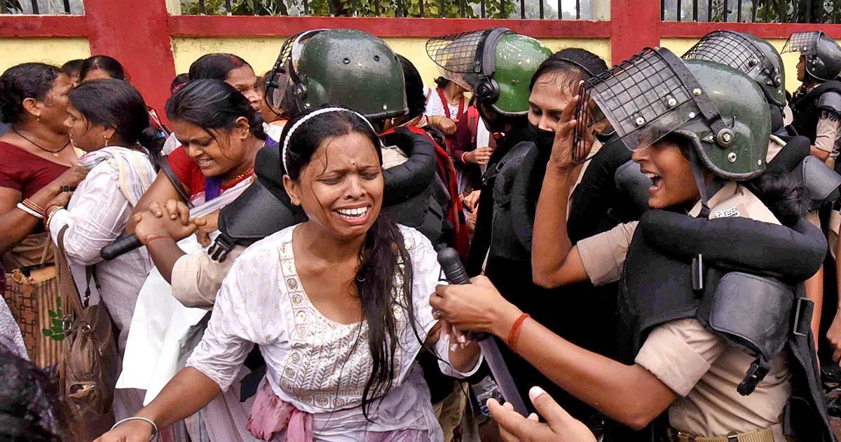 IMAGE: Women police personnel detain an Anganwadi worker.