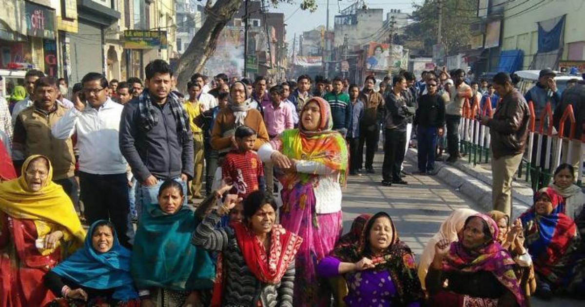 IMAGE: Kin of Chandan Gupta, along with local people, participate in a dharna in Kasganj on Tuesday. Photograph: PTI Photo