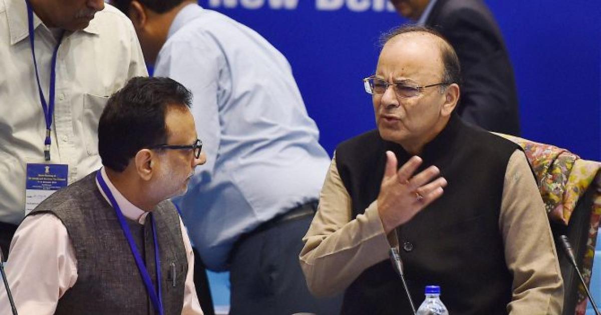 IMAGE: Union Finance Minister Arun Jaitley and Revenue Secretary Hasmukh Adhia at the 6th Goods and Services Tax Council meeting in New Delhi. Photograph: Kamal Singh/PTI Photo