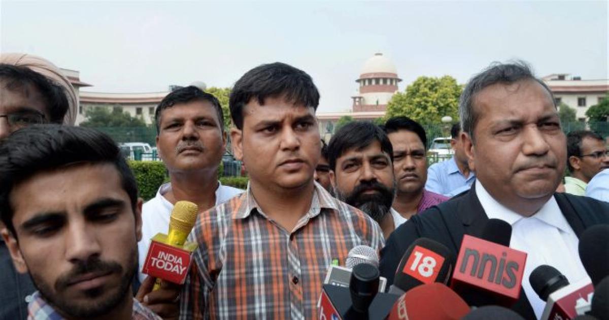 IMAGE: Barun Thakur, father of Pradyumna Thakur, outside the Supreme Court in September. Photograph: PTI Photo